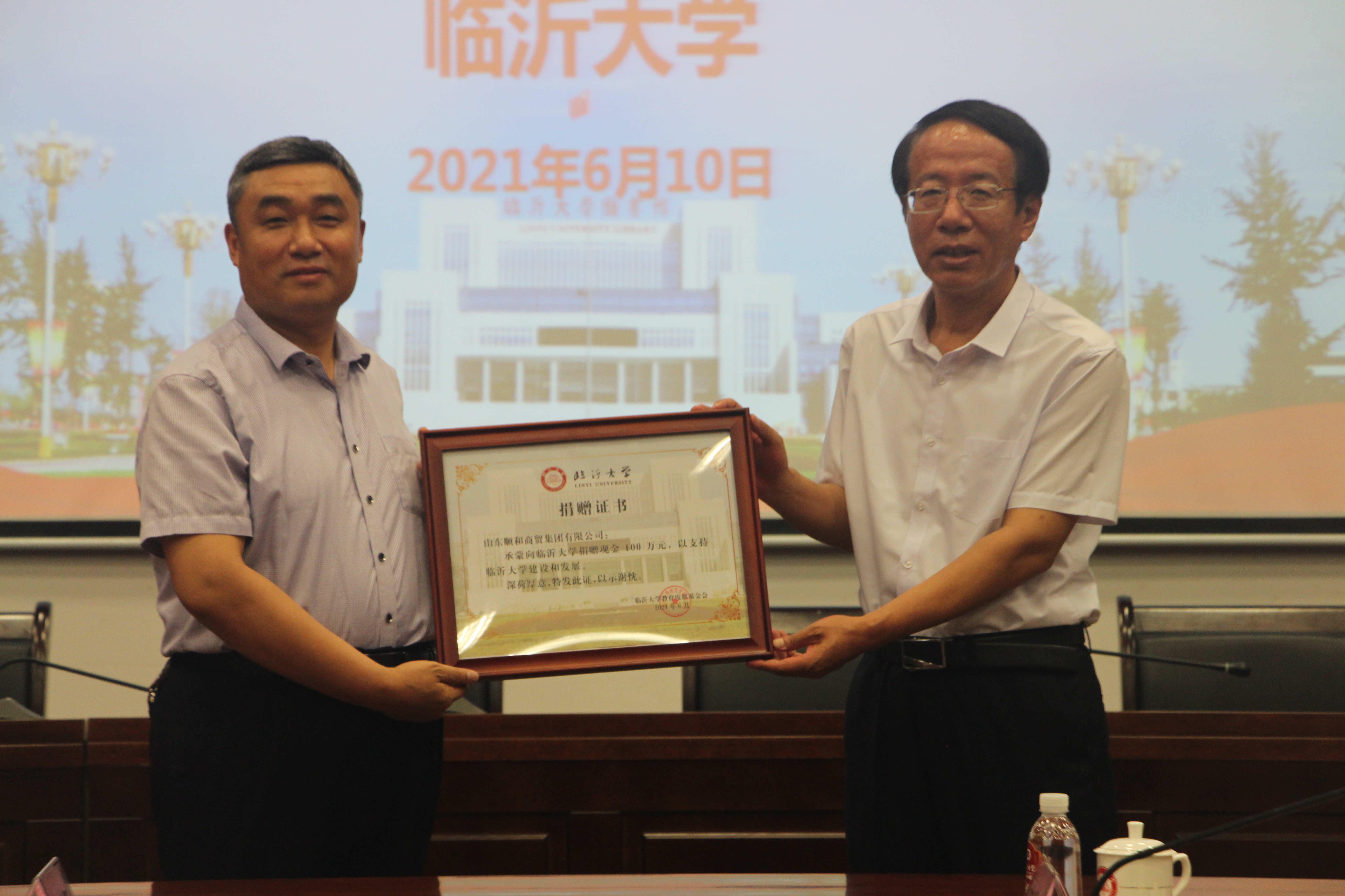 6月10日上午,山东顺和集团向临沂大学捐赠仪式在临沂大学校友中心隆重举行,山东顺和集团为临沂大学捐款100万元,助力教育事业发展。临沂大学党委书记王焕良出席仪式并致辞,临沂大学党委委员、副校长、教育发展基金会理事长孙常生接受捐赠并颁发捐赠证书。集团党委书记、董事长赵玉玺带领集团党委、董事会班子成员、顺和物联班子成员及集团财务、法务、人力、企管等办公室人员参加。仪式由临沂大学合作发展处处长、教育发展基金会秘书长赵勇主持。