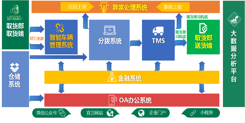企业重资研发八大系统、六大赋能平台,为专线企业赋能,凭借全网集货、共享分拨、一站分流、全程可视、一站查询等服务优势,从根本解决传统物流存在车等货、货等车、找车难、找货难、中转难、卸车难、查询难、风险大、成本高等痛点、难点问题,实现物流产业集约化、智能化、标准化、可视化、信息化、品牌化,从而有效提高货物流通效率,降低运营成本,推动临沂本土物流快速转型、高效发展。
