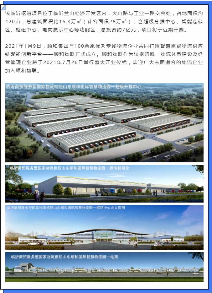 其增量项目临沂商贸服务型国家物流枢纽顺和国际智慧物流园是省市区重点项目,